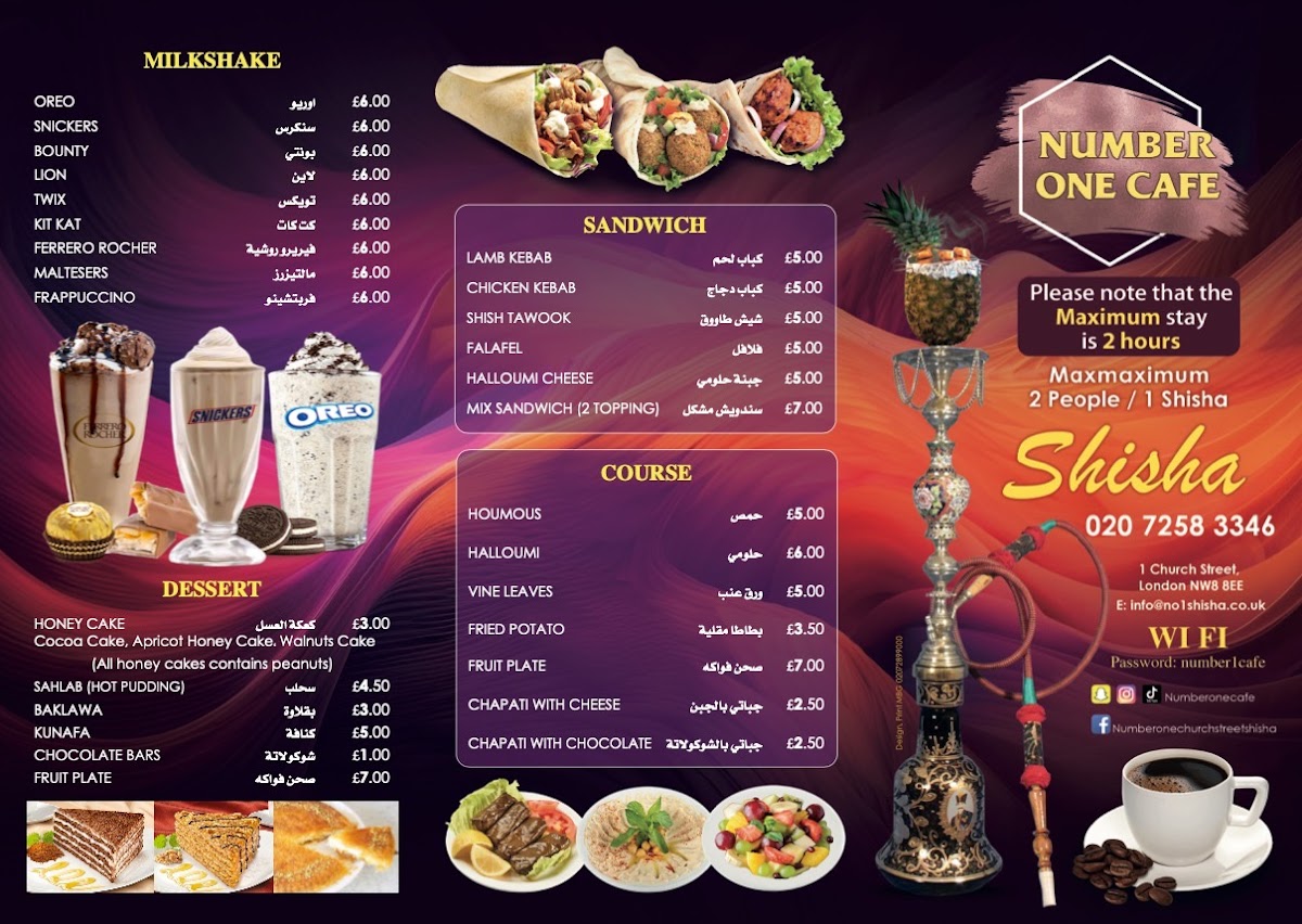 Welcome to Number One Church Street, a hidden gem nestled in the heart of London. This enchanting venue is not just a restaurant; it’s an experience. The atmosphere is vibrant yet relaxing, making it perfect for both social gatherings and quiet study sessions. Guests rave about the exceptional Turkish coffee and the delightful range of teas, particularly the renowned mint tea and karak tea. The menu also features delicious wraps and desserts, with the chicken wrap receiving special praise.